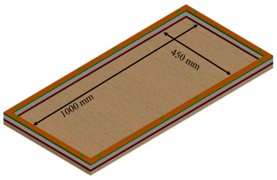 For casting the ferrocement panels, a special formwork was fabricated; the internal dimensions of the formwork are shown in Figure 4. The thickness of the formwork was comprised of three plies. In order to maintain the clear cover, the thickness of the outer two plies was kept equal to 5 mm, whereas the thickness of the middle ply was kept equal to 30 mm to make the total thickness of the panel 40 mm. The casting of mortar into the panel was performed on a vibrating table, and before casting, the formworks were cleaned and oiled. The casting was performed stepwise. First, a ply of 5 mm was placed on the formwork plate, and then the first meshing layer was placed. The reinforcing mesh size was kept around 75 mm more on each side of the formwork for easy stretching and to avoid sagging during the pouring of mortar. In the next step, a second ply of 30 mm was placed, and two longitudinal steel bars of 6 mm were provided as skeletal reinforcement at mid-height in the longitudinal direction only. The mortar was poured gradually in layers until it reached a depth of 35 mm and was then vibrated for a few seconds to attain proper compaction by removing air bubbles. Afterward, the second layer of reinforcing mesh was placed in a stretching state and the remaining ply of 5 mm was placed over the formwork. Lastly, the remaining thickness was filled with mortar and compacted to have a smooth surface. Figure 5 shows formwork panels with iron mesh and plastic mesh before and after casting. The formwork was opened after 24 h, extra mesh was ground using a cutter, edges were plastered, and panels were cured for 28 days by placing them in moistened jute bags.