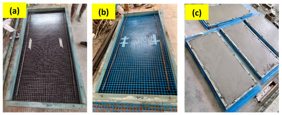 Casting process of ferrocement panel: (a) formwork with steel mesh, (b) formwork with plastic mesh, and (c) panels after complete pouring of mortar.