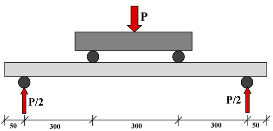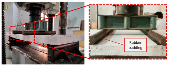 The ferrocement panels were tested for flexure using a four-point bending test. The total span and loading positions are illustrated in Figure 6. The bending test was performed on a fully calibrated and computerized universal testing machine (UTM). The load (P) was applied using a displacement control procedure with a loading rate of 1 mm/s. The testing data were recorded in terms of machine stroke (mm) versus load in kN through the built-in data acquisition system in the UTM. Rubber padding was used under the roller pins to assure a uniform application of the load on the panel surface. The complete experimental step is shown in Figure 7.