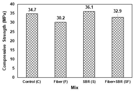 The compression test was performed on three cube specimens of each mix type, and their average results are presented in Figure 8. The control specimens (C) indicated a compressive strength of 34.7 MPa. The inclusion of 0.5% PP fibers (F) reduced the strength to 30.3 MPa, which is mainly attributed to the reduction in density and increment of the interfacial transition zone in the mortar mix [38]. The high binding and crack-bridging characteristics of SBR latex contribute to the compressive strength of the concrete and mortar mix [23,39], and due to this reason, the compressive strength of mix (S) with SBR latex improved to 36.1 MPa. Since the addition of PP fibers has an adverse effect on compressive strength, a hybrid mix (SF) was also prepared via adding 5% SBR latex along with 0.5% PP fibers by weight of cement. The results for the hybrid mix (SF) indicated an improvement of 8.94% (32.9 MPa vs. 30.2) in its compressive strength as compared to the mix with PP fibers (F) only; however, strength was still around 5.18% less than the control mix (c).