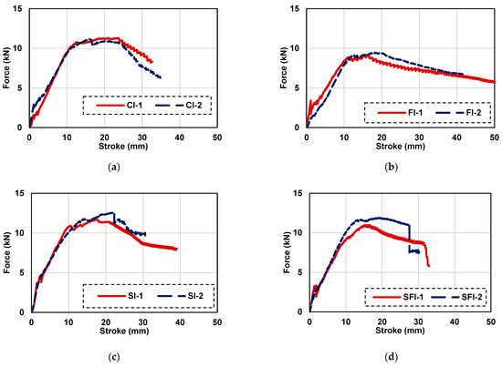 The load-displacement responses of four-point bending tests for ferrocement panels reinforced with iron mesh are presented in Figure 9. Test results of steel mesh ferrocement panels for the control panel (CI), the panel with PP fibers (FI), the panel with SBR latex (SI), and the panel with both fibers and SBR latex (SFI) are given in Figure 9a–d, respectively. For flexure, displacement-controlled loading was applied at 1 mm/min. Results are presented for two specimens prepared using iron mesh. For all mixes, in steel mesh ferrocement specimens, the initial linear part of the curve is up to the point when cracking in the mortar occurs at the tension face, as shown in Figure 10. After cracking of the outer surface, additional strength is contributed by the steel mesh and load carrying capacity is increased to peak load. The observed fracture phases are the same as those reported by various prior research studies [13,16]. The test was stopped when the post-peak load dropped to around 80 percent of the maximum load. The peak load of each specimen for each mix is summarized in Table 7. Peak average load and its percentage difference (increase/decrease) with respect to control is also presented in Table 7. The average peak flexural load dropped by about 17 percent with reference to the control mix when polypropylene fibers were added to the mortar mix. One of the reasons for this decrease in strength is related to the interfacial bond between the fibers and the cement matrix. Polypropylene fibers tend to have a smooth surface, which can make it difficult for them to bond well with the cement matrix. This weakens the interfacial bond, making the composite material less strong and less durable. Similar results regarding a drop in the flexural strength of concrete and mortars have been reported in past studies [38,40]. On the other hand, the average peak flexural load of ferrocement panels with steel mesh was increased by about 8.2 percent with respect to the control specimen when SBR latex was added in the mortar mix. The addition of SBR latex to the cement matrix can improve the bonding between the cement and the steel reinforcement, resulting in increased strength and ductility of the ferrocement panels. The polymer particles of SBR latex can fill the pores in the cement matrix, leading to improved density and reduced permeability of the composite. This can reduce the risk of cracking and increase the durability of the ferrocement panels.