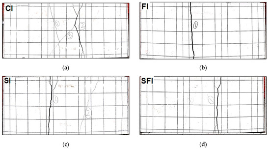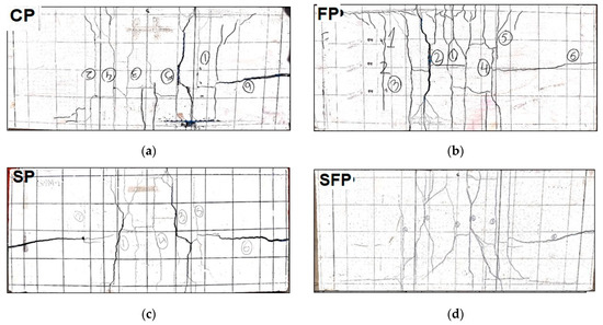 Fracture pattern of ferrocement panels with iron mesh: (a) control, (b) with PP fibers, (c) with SBR latex, and (d) with PP fibers and SBR latex.