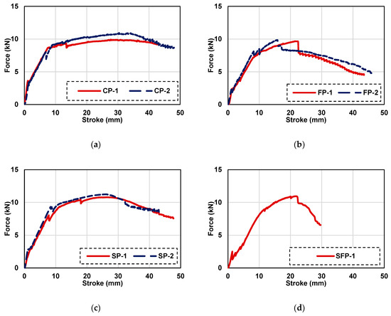 The load displacement curves of ferrocement panels reinforced with plastic mesh are presented in Figure 11. Test results of plastic mesh ferrocement panels for control panels (CP), panels with polypropylene fibers (FP), panels with SBR latex (SP), and panels with both fibers and latex (SFP) are given in Figure 11a–d, respectively. Displacement-controlled loading was applied at 1 mm/minute. Results are presented for two specimens prepared using plastic mesh. For the mix with SBR latex and polypropylene fibers with plastic mesh, only one specimen’s results are given. The data of the second specimen could not be recorded due to a power outage during the test. For all mixes, transverse cracks initially appeared in the central zone of the ferrocement specimen slab, as shown in Figure 12, which causes the loss of stiffness due to the fracture of the mortar. After cracking of the outer surface, additional strength is contributed by the plastic mesh, and load carrying capacity is increased to peak load. After first cracking, due to the large ductility of plastic mesh, the stress is redistributed in a low-stress region and results in smeared cracking, as shown in Figure 12. This shows the more ductile behavior and higher energy dissipation characteristics of plastic mesh. It is also evident when the load displacement curves of plastic mesh panels are compared with steel mesh panels, having more post peak response. It can also be observed from the figure that for each mix, both specimens behave almost identically. The peak load of each specimen for each mix is summarized in Table 7. Peak average load and its percentage difference (increase/decrease) with respect to control are also presented in Table 7.