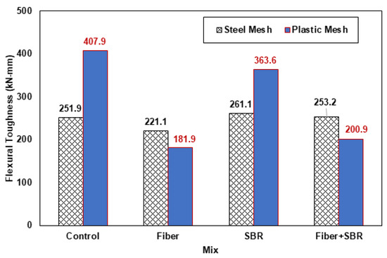 The flexural toughness was calculated for all specimens of ferrocement panels with steel and plastic mesh, corresponding to the area under the load displacement curves. For this purpose, curves were used from origin to 0.8 times the peak load after maximum load. The results are summarized in Table 8 with average flexural toughness and with percent difference with respect to control specimens. Average flexural toughness results are compared for both steel and plastic mesh ferrocement panels in Figure 13. Average flexural toughness is increased by about 62% for the control plastic mesh panels (407.9 kN-mm) than the control steel mesh panels (251.9 kN-mm). Additionally, average flexural toughness of plastic mesh panels is about 39.2% more with SBR latex (363.6 kN-mm) than corresponding steel mesh panels (261.1 kN-mm), whereas in other cases, it was reduced for plastic mesh panels. One thing to note is that peak load was less in cases of plastic mesh panels than steel mesh panels. However, the maximum displacement values were higher in all plastic mesh ferrocement panels than in those with steel mesh. To improve the flexural toughness of plastic mesh ferrocement panels, skeleton steel bars may also be used.