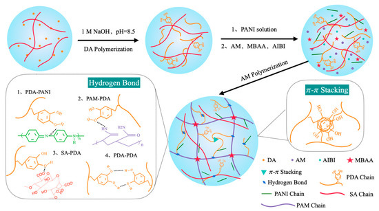 The schematic and fabrication process of the PAM/SA/PDA/PANI hydrogel.