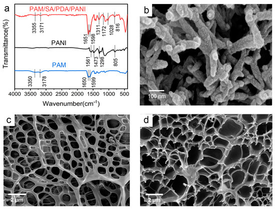 (a) FTIR spectra of PANI powder, PAM hydrogel and PAM/SA/PDA/PANI hydrogel; (b) SEM images of PANI powder; (c) SEM image of PAM hydrogel; (d) SEM image of PAM/SA/PDA/PANI hydrogel.