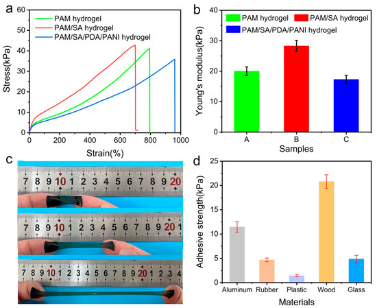 (a) The representative stress-strain curves of PAM, PAM/SA and PAM/SA/PDA/PANI; (b) The Young’s modulus of PAM, PAM/SA and PAM/SA/PDA/PANI; (c) The adhesion behavior of PAM/SA/PDA/PANI hydrogel upon stretching; (d) The adhesive strength of the PAM/SA/PDA/PANI hydrogel on difference surfaces.