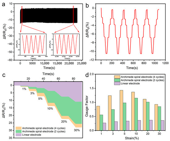 Testing results of the hydrogel-based sensor with nickel-chromium wire as electrodes. (a) The relative resistance change of the encapsulated hydrogel-based sensor upon 500 of cyclic compression tests; (b) The relative resistance change of the hydrogel-based sensor in the compression and recovery steps in the step strain tests; (c) The relative resistance change of the hydrogel-based sensor with different electrodes; (d) The GF of the hydrogel-based sensor with different electrodes upon compression.