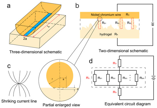 (a) Schematic of the contact state between the hydrogel and the metal electrode; (b) The circuit schematic; (c) Schematic diagram of shrinking current line; (d) The equivalent circuit diagram.