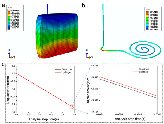 Simulation analysis results. (a) Displacement cloud diagram of sample; (b) Displacement cloud diagram of Nickel-chromium wire electrode; (c) Displacement-analysis time curve of hydrogel and Nickel-chromium wire electrode.