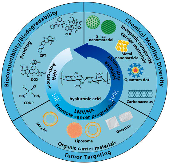 HA-based drug nanocarriers have been used in anticancer therapies. Agrawal et al. [8] prepared LPT-HA-NCs by encapsulating nanocrystals of lapatinib (LPT-NCs) with HA to improve their therapeutic efficacy towards triple-negative breast cancer. The results showed that the encapsulated drug carrier exhibited superior anticancer activity to the free drug, and effectively inhibited the metastasis of cancer cells to other sites. Therefore, we have summarized the recent advancements regarding HA-based anticancer nanocarrier families, which include macromolecular prodrugs, inorganic composite nanomaterial carriers and organic carrier materials.