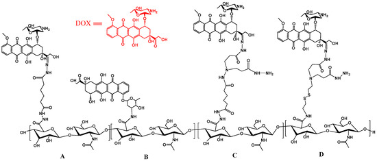 The chemical structure of HA-DOX conjugate. (A) DOX is linked to a HA-ADH (adipodihydrazide-modified HA) derivative; (B) DOX is directly conjugated to carboxylic groups of HA; (C) DOX is linked to a modified HA with dihydrazone groups; (D) DOX is linked to a modified HA with disulfide linkage.