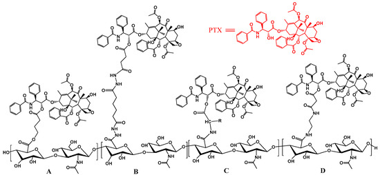 The chemical structure of the hyaluronan-PTX conjugate. (A) A hemisuccinate N-hydroxysuccinimide (NHS) activated ester of PTX is linked to an HA-ADH derivative; (B) A 2′-PTX-4-bromobutyrate is conjugated to HA; (C) An amino acid-PTX derivative is linked to HA activated by carbodiimide; (D) A hemisuccinate NHS activated ester of PTX is linked to an HA-ethylenediamine derivative.