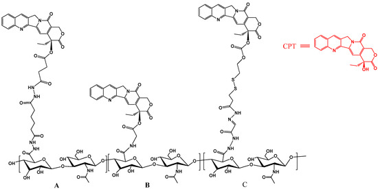 The chemical structure of the hyaluronan-CPT conjugate. (A) An amino acid-CPT derivative is linked to an HA-ADH derivative; (B) CPT is directly conjugated to carboxylic groups of HA; (C) CPT is linked to a modified HA with disulfide linkage.