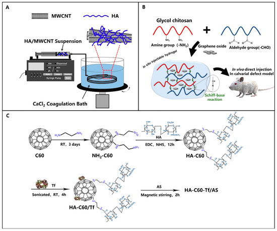 Schematic diagram of the mechanism based on HA-modified carbonaceous nanomaterials. (A) Hybrid microfibers composed of HA and multi-walled carbon nanotubes (MWCNTs) were prepared using wet spinning - reprinted from [36]. (B) Schematic representation of hydrogel preparation and in vivo action - reprinted from [37] with permission from Elsevier (2020). (C) Schematic diagram of the preparation process of HA-C60-Tf/AS - reprinted from [38] with permission from Elsevier (2015).
