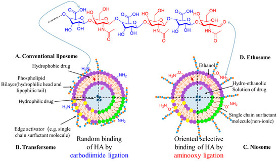 Schematic representation of random and oriented selective binding of HA to (A) liposomes, (B) transfersomes, (C) niosomes and (D) ethosomes. Picture adapted from [64].