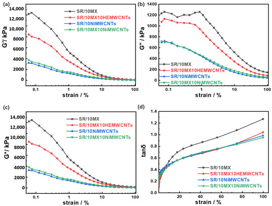 As shown in Figure 1b, the loss modulus of the SR/10MX decreased greatly with the increaseof shear strain and became lower at high strain than that of the samples with the highly electric conductive multi-walled carbon nanotubes. The difference of the loss modulus of the four samples was mainly caused by vulcanization degree, which was influenced by the heat transfer of the fillers. The higher the degree of cross-linking, the smaller the distance between the cross-linking points, the greater the rigidity of the composites, and the faster the response speed to strain with less loss. With a combination of MXenes and HEMWCNTs, or Mxenes only, the composites show a lower cross-linking degree, leading to more terminal groups of molecular chains with more loss, hysteresis loss, and a higher loss factor, which are consistent with those shown in Figure 1d.