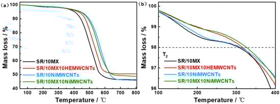 The high temperature resistance and ash content of silicone rubber/multi-walled carbon nanotubes/Mxene composites were tested by the thermogravimetric tester, as shown in Figure 2a. To compare heat resistance, temperature corresponding to 2% weight loss is shown in Figure 2b. Filled with Mxenes, the samples SR/10MX10HEMWCNTs and SR/10MX10NiMWCNTs lost 2% weight at 316 °C and 327 °C, respectively, which were 10 °C and 17 °C higher than the other two samples, respectively. These materials contained more electric conductive fillers which degraded at a high temperature, while the ash content was calculated as 50.5% and 48.9% respectively, partly from the residual metal after the Mxenes were degraded. The decomposition residues of the SR/10MX and SR/10NiMWCNTs were 46.4% and 46.2%, respectively. The overall residues were higher due to the residual carbon and metal elements in the samples during thermal weight loss in nitrogen.