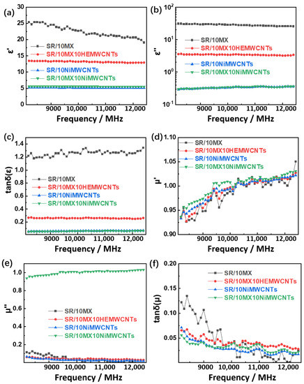 As shown in Figure 5a, the dielectric constant (ɛ′-real part) of the sample SR/10MX shows a downward trend while the others are stable, and no obvious change of the ɛ″-imagery part was observed for any of them with the increase of the frequency from 8200 MHz to 12,400 MHz in Figure 5b. While the chemical energy kept up with the change of the electric field, the dipole orientation polarization response was not timely to a lower dielectric constant in high frequency for SR/10MX. However, the dielectric constants (ɛ′-real part) of the other three samples were basically stable, and the ɛ′-real part of the latter two with the nickel-added multi-walled carbon nanotubes was around five, and the dielectric constant (ɛ′-real part) of the SR/10MX10HEMWCNTs was fourteen. Both the real part and the imaginary part of the dielectric constant of the SR/10MX were significantly reduced by the highly electric conductive multi-walled carbon nanotubes.