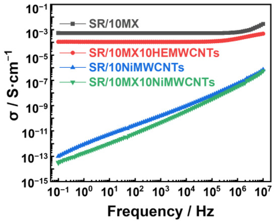 As shown in Figure 6, silicone rubber/highly electric conductive multi-walled carbon nanotube/MXene composites have a good conductivity of more than 10−4 S/cm, compared to the composites with nickel-added multi-walled carbon nanotubes. Moreover, the conductivity of the SR/10MX composites was close to 10−3 S/cm, indicating that the Ti3C2MXenes are excellent conductive fillers.