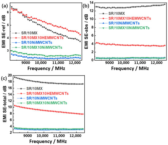In the range from 8200 MHz to 12,400 MHz, all the samples with nickel-added multi-walled carbon nanotubes showed a low electromagnetic shielding reflection, absorption, and total effectiveness as shown in Figure 7a–c, respectively. The reflection effectiveness of the SR/10MX10HEMWCNTs markedly decreased with the frequency, but the absorption effectiveness also decreased slightly, while the total effectiveness decreased slightly from 11 dB to 8 dB with the change in frequency. For the SR/10MX composites, the reflection effectiveness clearly decreased with the increase in frequency, but the frequency response behavior of absorption efficiency was low, and the total effectiveness decreased slightly from 20 dB to 17 dB to perform a good electromagnetic shielding performance.