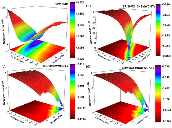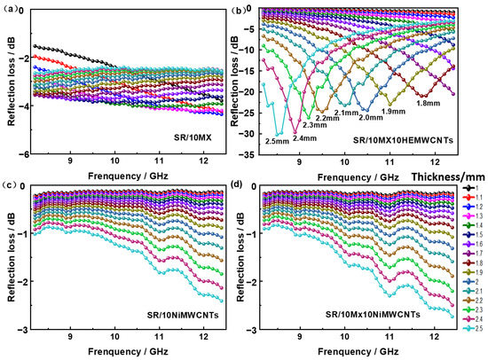 From Figure 8a,c,d, it can be observed that the sample SR/10NiMWCNTs has a minimum reflection loss of −2.5 dB, while the SR/10MX10NiMWCNTs had a minimum reflection loss of −2.8 dB, and SR/10MX showed a minimum reflection loss of −4.1 dB, respectively. These three composites were far from satisfying the application requirement to be excellent microwave absorbing materials.