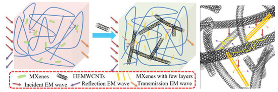 Without the HEMWCNTs present in the matrix, the electromagnetic wave was reflected and transmitted through an internal reflection absorption by the MXenes with multi-layers in the composites. When the electromagnetic wave has to pass through the silicone rubber composites with the MXenes and HEMWCNTs, the internal reflection becomes more complicated, and more wave energy of electromagnetic is consumed, resulting in less for reflecting and passing.