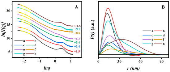 Ln–Ln plots (A) deriving from the SAXS patterns (Yellow lines: the fitting lines are based on the power low, and the vertical offset values are presented on the right Y-axis) and corresponding PDDF curves (B) of (a) BMMs, (b) M-BMMs, (c) P(NIPAM-co-AA)@BMMs, (d) PAN@BMMs-I-0.05, (e) PAN@BMMs-I-0.1, (f) PAN@BMMs-I-1, (g) PAN@BMMs-II-0.1, and (h) PAN@BMMs-mix-0.1.