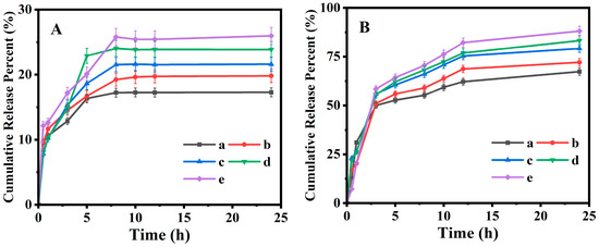 Considering the influences of the temperature- and pH-responsive performance on the monodisperse of fluorescent AN during the swelling–shrinking process, the sensitivity of the resultant PAN@BMMs was systematically investigated using the Dh values measured using the DLS method in PBS at pH values of 2.0 and 7.4 at 25 °C and 37 °C. In particular, the particle size distribution of pure BMMs (Figure S8) showed that the average Dh value was around 196 nm. In addition, the variation of mean Dh values with different swelling and shrinking times was obtained in Figure 5A,B. As can be seen, the mean Dh value of PAN@BMMs-I-n increased with the prolonging of swelling time under pH 7.4 at 25 °C (Figure 5A) but decreased abruptly in pH 2.0 at 37 °C (Figure 5B). For example, the Dh value of PAN@BMMs-I-0.1 was 490 nm for 1 h, 815 nm for 3 h, 931 nm for 8 h, 963 nm for 12 h, and eventually 1668 nm for 24 h at pH 7.4 at 25 °C (Figure 5A (b)) but 931 nm for 1 h, 808 nm for 3 h, 778 nm for 8 h, 754 nm for 12 h, and 658 nm for 24 h at pH 2.0 at 37 °C (Figure 5B (b)). Similar trends were also present in PAN@BMMs-I-0.05 (Figure 5A (a) and B (a)), PAN@BMMs-I-1 (Figure 5AB (c)), PAN@BMMs-II-1 (Figure 5AB (d)), and PAN@BMMs-mix-0.1 (Figure 5AB (e)). The Dh values of the swollen PAN@BMMs in pH 7.4 at 25 °C were up to 1377 nm for PAN@BMMs-I-0.05 (Figure 5A (a)), 2001 nm for PAN@BMMs-I-1 (Figure 5A (c)), 1819 nm for PAN@BMMs-II-0.1 (Figure 5A (d)), and 1304 nm for PAN@BMMs-mix-0.1 (Figure 5A (e)), while their shrunken Dh values in pH 2.0 at 37 °C were 759 nm (Figure 5B (a)), 536 nm (Figure 5B (c)), 613 nm (Figure 5B (d)), and 526 nm (Figure 5B (e)). In essence, the swelling behavior was due to the electrostatic repulsive forces among –COO– originating from the deprotonation of the –COOH groups in PAN chains when the pH was above the pKa of PAA (4.8), whereas below it, the intra-molecular hydrogen bonding between the polymer crosslinking networks was formed due to the protonated –COOH groups [58], resulting in the shrinking of the P(NIPAM-co-AA) at pH 2.0. This swelling–shrinking feature was one of the hallmark characteristics of the lesion microenvironment, endowing PAN@BMMs as nanocarriers with great potential in controlled release for drug delivery.