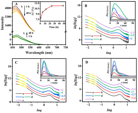 The dm value of the obtained PAN@BMMs-I-0.1 (Figure 4A (e)) was about 2.53 (±0.04), which was smaller than the dm values of 2.61 (±0.04) for PAN@BMMs-II-0.1 (Figure 4A (g)) and 2.82 (±0.04) for PAN@BMMs-mix-0.1 (Figure 4A (h)). These variations of fractal features may be related to different dispersion states of fluorescent molecules that vary by doping method. Meanwhile, the dmax value slightly increased from 2.48 (±0.04) for PAN@BMMs-I-0.05 (Figure 4A (d)) to 2.70 for PAN@BMMs-I-1 (Figure 4A (f)), indicating that the introducing of a larger AN cluster onto the PAN shell in PAN@BMMs tended towards the densification evolution.