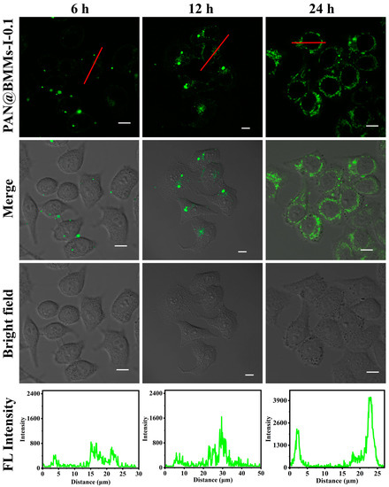 Time-dependent CLSM images (6 h, 12 h, and 24 h, respectively) of HeLa cells incubated with PAN@BMMs-I-0.1 at a concentration of 20 μg mL−1, scale bars were 10 μm. Notes: The FL intensity profiles represent the red lines that crossed the cells.