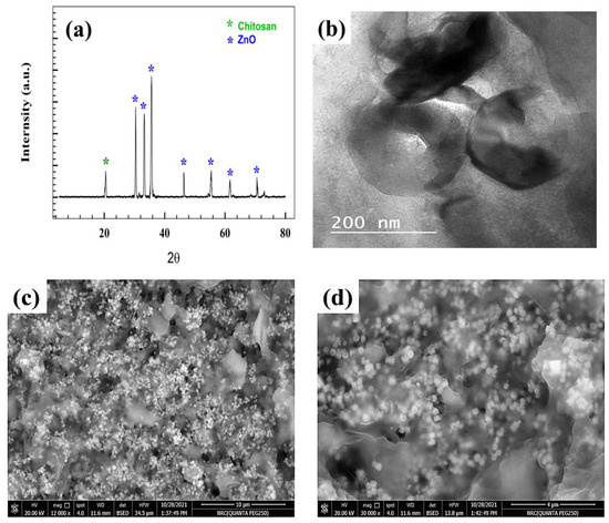 The scanning electron microscope (SEM) was utilized to characterize the surface morphology of Zn-Chit, as illustrated in Figure 1c,d. The scanning electron microscopy (SEM) images of ZnO nanoparticles incorporated within chitosan sheets revealed the presence of hexagonal nanocubes.