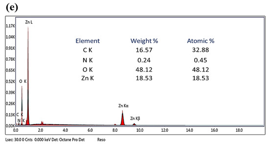 Energy-dispersive X-ray spectroscopy (EDX), a technique for elemental analysis, was employed to identify the existence of elements, including Zn, C, N, and O (see Figure 1e). The atomic ratios of Zn and O suggest the existence of ZnO and the lack of adulteration from other constituents in the specimens. Additionally, the presence of the carbon and nitrogen on surface attributed to the chemical structure of chitosan.
