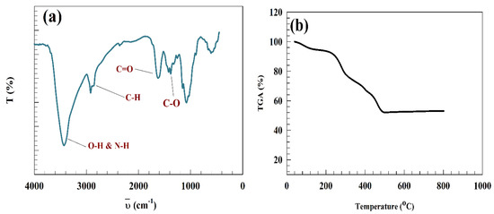 Representation of (a) IR spectra of Zn-Chit. (b) TGA curve of Zn-Chit.