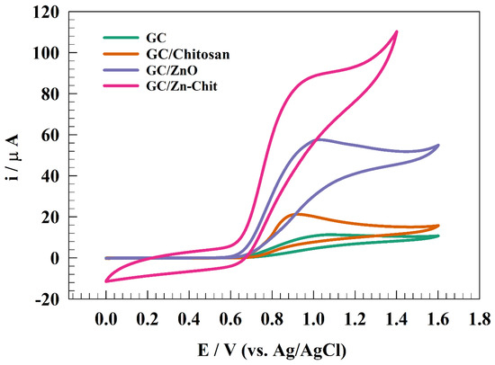 The present study investigated the efficacy of various modified GC electrodes, specifically GC/Chitosan, GC/ZnO, and GC/Zn-Chit, in detecting nitrites through the cyclic voltammetry (CV) technique. The experiment was utilized in a solution of 0.05 M phosphate buffer (pH = 7) in the presence of 50 µM of nitrite, with a sweep rate of 10 mV s−1. One oxidation peak was observed in the potential range 0.8~1.0 V (vs. Ag/AgCl). For instance, the estimated Eps were observed to be 1.01, 0.94, 1.02, and 0.99 V for GC, GC/Chitosan, GC/ZnO, and GC/Zn-Chit, respectively. The forward peak indicates the transformation of N into N. The electrochemical detection of nitrite is deemed irreversible due to an undefined backward peak and the lack of reduction peaks. Figure 3 shows the activity of the Zn-Chit surface toward nitrite detection compared to pristine ZnO counterparts. However, the well distribution of ZnO on chitosan sheets enhanced the detection process by increasing the compatibility between the ZnO and the glassy carbon electrode.