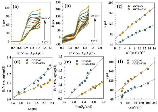 For a complete understanding of nitrite sensing, kinetic parameters were estimated for nitrite oxidation over the modified electrodes. Figure 5a,b show Cvs. of the modified GC/ZnO and GC/Zn-Chit in a solution of 0.05 M PBS and 50 µM of nitrite at a wide range of scan rate (0.005 to 0.2 V s−1 (vs. Ag/AgCl)).