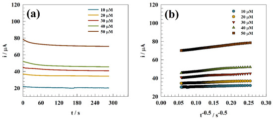 The Cottrell equation [70,71,72] was used to determine the average diffusion coefficient of nitrite molecules at a GC/Zn-Chit-modified electrode at a potential of 0.85 V (vs. Ag/AgCl) in a solution of 0.05 M PBS and several nitrite concentrations, as follows: