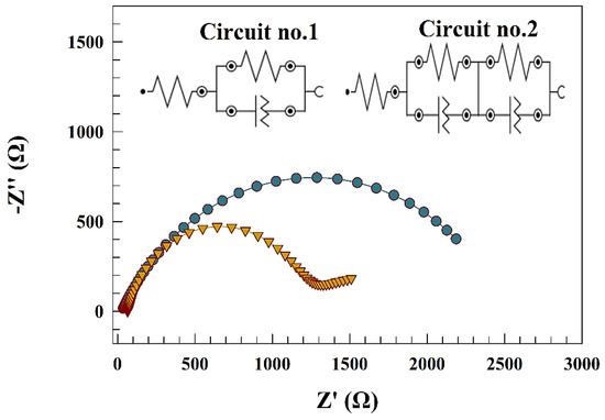 The activity of both electrodes was utilized by EIS. Figure 7 represents Nyquist plot for the GC/ZnO and GC/Zn-Chit surfaces at a constant potential of 0.85 V (vs. Ag/AgCl). However, EIS data was fitted using NOVA software. The inset figure represents the fitting circuits of the corresponding Nyquist results. However, circuit number one is attributed to the GC/ZnO electrode that included solution resistance (Rs) connected in series with a cell of charge transfer resistance (Rc) connected to a constant phase element (CPE). On the other hand, Nyquist data for GC/Zn-Chit fitted by circuit number two includes solution resistance (Rs) connected to two cells of resistance and a constant phase element. Whereas the presence of two cells is attributed to two layers of surface behavior. However, the Nyquist plot’s diameter reflects the electrode’s activity. The lower diameter represents the higher charge transfer process and respectable activity toward nitrite sensing. The charge transfer resistances of 2480.8 and 1192.3 Ω were evaluated for GC/ZnO and GC/Zn-Chit electrodes, respectively. Table 2 contains the reported fitting data for the modified electrodes.