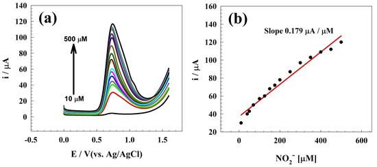 where, i is the nitrite’s oxidation current, n is the number of electrons (n = 1), A is the electrode’s surface area, D is the analyte diffusion coefficient, Co is the analyte concentration, and is the scan rate.
