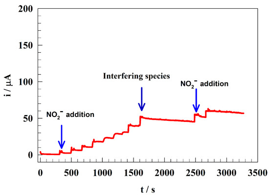 where, i is the current, n is the number of oxidizing electrons (n = 1), F is the Faraday constant and A is the electrode surface area, and t is the operating time. As represteneted in Figure 6b, diffusion coefficient estimated using the slope of the Cottrell relation. Whereas, the provided diffusion values for nitrite equaled 6.1 × 10−4, 3.07 × 10−4, 4.7 × 10−4, 6.2 × 10−4, and 5.4 × 10−4 cm2 mol−1 for 10, 20, 30, 40, and 50 µM, respectively.