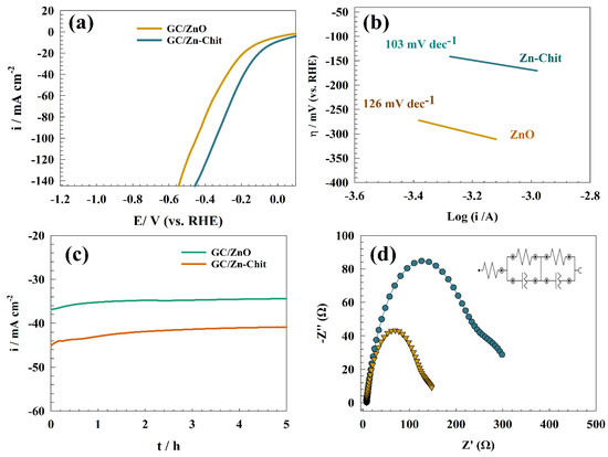 Hydrogen evolution reactions on GC/ZnO- and GC/Zn-Chit-modified surfaces were investigated. Figure 10a represents the LSV of the modified electrodes in a solution of 0.5 M H2SO4 at a scan rate of 10 mV s−1. However, the presence of chitosan and ZnO composite enhanced the efficiency of the hydrogen production process. Whereas, the mechanism of hydrogen evolution mainly consists of adsorption steps, as follows [74,75]:
