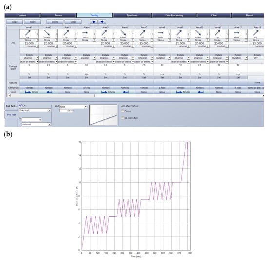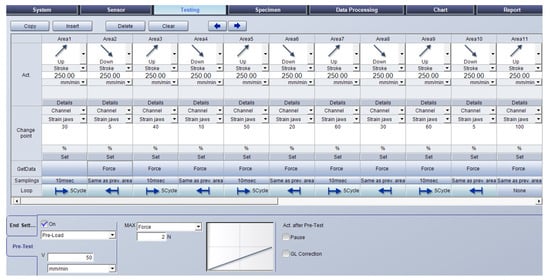 The testing method, as described step by step above, is shown as defined in the control screen panel of the software TrapeziumX in Figure 2. The experiments were carried out at a temperature of 20 °C. The fifth cycle for each cycle loop is evaluated as a result of experiments.