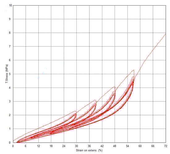 The five-cycle loops are used. Every cycle loop consists of five cycles. Every cycle is defined as a load to a certain strain between the jaws of the test machine and an unloading to a certain strain between the jaws. The control of the testing machine was performed by measuring the strain between the jaws with the machine control sensor gauge. The first cycle loop consists of cycles with loading at 30% and unloading at 3% of strain (but not 0% because under approx. 2% of elongation, there is a compressive force during tensile testing for composite specimens with textile reinforcement). The next cycle loop consists of cycles with strain 10% higher than in the previous cycle loop, according to literature [6]. Therefore, the second loop consists of cycles with loading to 40% and unloading to 10% of strain; the third loop consists of five cycles with loading to 50% and unloading to 20% of strain; and the fourth loop has cycles with loading to 60% and unloading to 30% of strain. The fifth loop has cycles with different strains; the loading to 60% is the same as the fourth loop, and the unloading is 5% of the strain. The final step is loading to 100% of the strain. Relaxation stress was not considered [6].