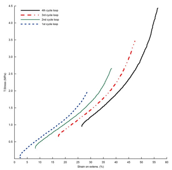 The force values after relaxation time for each cycle loop are in Table 9. The transformation of force values to stress values is given in Table 9. The fineness (linear density) of the textile-conditioned cord is 944 dtex; therefore, stress can be obtained as force divided fitness. The unit of stress is deliberately adjusted so that the calculated stress values are in the range from 0 to 100 for better comparison of the values with each other. Therefore, the stress for textile materials is given in multiples of the force unit, e.g., in cN (100 cN is 1 N), divided by fineness, e.g., in tex instead of dtext (10 tex is 1 dtex). In our case, we chose the unit of stress as cN·tex−1.