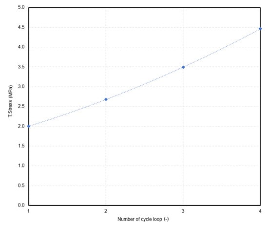 The true stress values for the maximum strain of the fifth cycle of the loops are in Table 5. Based on the results (Figure 6), there is a relationship between stress and the number of cycle loops as shown by the second-degree polynomial curve with an R-squared of 1: