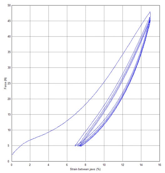The evaluation will be in terms of the dependence of the force on the strain between the jaws. For textile materials, stress in MPa is not considered, but in e.g., cN·tex−1. Therefore, knowledge of force is important from cycle loading tests. Figure 7 shows the dependence on the test without relaxation and the use of the video-extensometer. The method with 15% (preload 2.35 N and 10 mm·min−1, the specimen with an initial length of 250 mm between jaws, loading to 15% strain, unloading to 5 N) was used with a loading speed 250 mm·min−1. The force is 44.22 N at a strain of 14.94% for the fifth cycle.