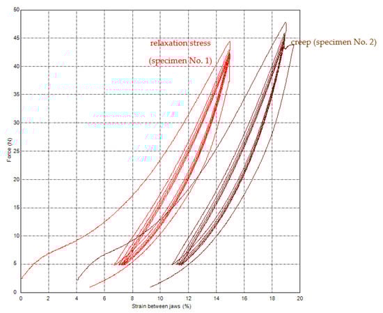 Figure 8 shows the results of tests with the same conditions, only with relaxation, stress, and creep for 120 s. The right curve with creep is shifted on the x-axis by 4% to the right for better comparison. Relaxation stress (specimen No. 1): force change after a time of 120 s is 3.89 N (force after the fifth cycle is 41.21 N, force after relaxation time is 37.32 N). It changes about 9.4% of force after the fifth cycle. Creep (specimen No. 2): strain change after a time of 120 s is 0.69% (strain after the fifth cycle is 14.9%, strain after relaxation time is 15.59%). It is a change of about 4.6% of strain after the fifth cycle 14.9%.