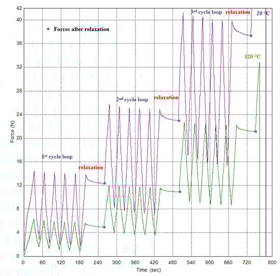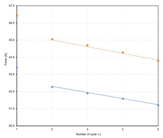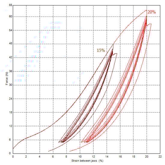 Furthermore, the method with 20% strain was changed to compare the results with the method with 15%. A comparison of the dependences between force and strain between jaws is shown in Figure 10. The method is with creep. Force values after individual cycles are in Table 8.