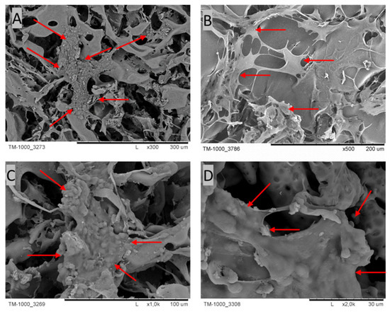SEM micrographs of cross-sections and the top layers of PES scaffolds after 4 weeks of culture. The red arrows indicate cells with their ECM. Scale bars: (A) 300 µm; (B) 200 µm; (C) 100 µm; (D) 30 µm.