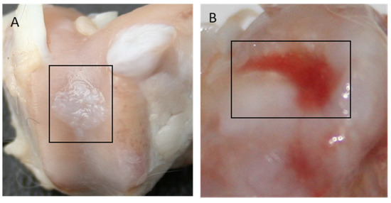 Gross appearance of the cartilage defect at 52 weeks after implantation for Group II (A) and Group V (B).